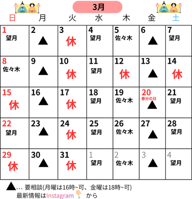 カレンダーを掲載しました。出勤予定などはカレンダーをご確認ください。
